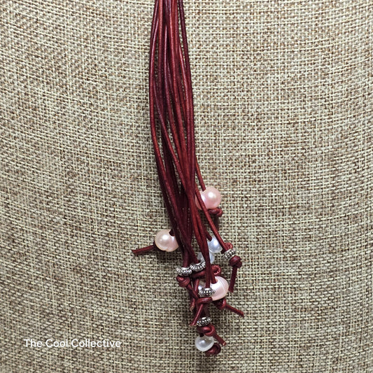 Rose Quartz Donut on Turkish Red Leather Tassel Necklace & Freshwater Pearls in Pink & White and Silver Tone Accents - Adjustable Style