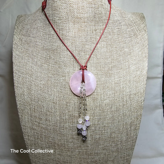 Rose Quartz Donut & Beads, Silver Tone Chain Tassels and Accents on Turkish Red Leather - Adjustable Style and Earrings