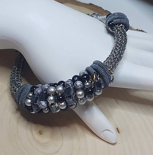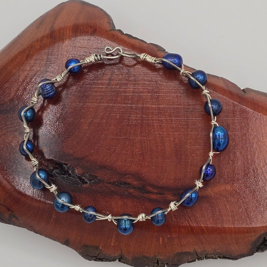 Royal Blue Pearls on Wire Wrapped Silver Frame Bangle Bracelet