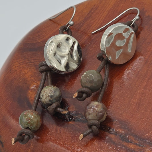 Silver Tone Rippled Button with Dark Brown Leather, Gemstones, and Stainless Steel Ear Wires