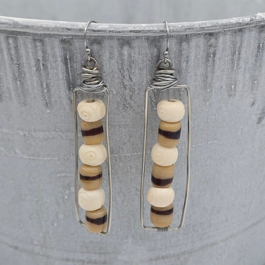 Silver Tone Wire Wrapped Earrings with Striped & Carved Bone on Stainless Steel Ear Wires
