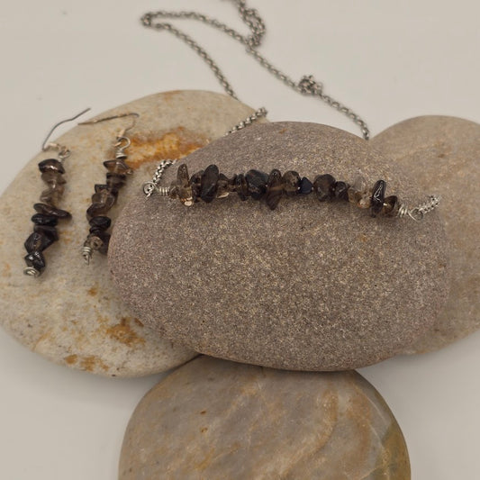 Smoky Quartz Bar Necklace & Earrings on Stainless Steel Chain and Ear Wires