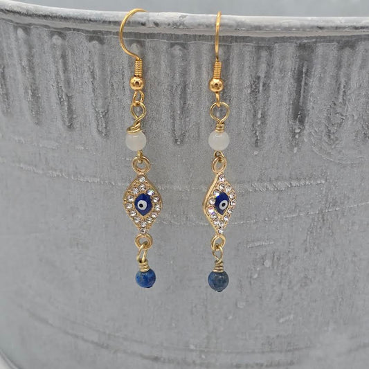 Sparkly Evil Eye Protector Earrings With White Quartzite & Sodalite on Gold Tone Ear Wires