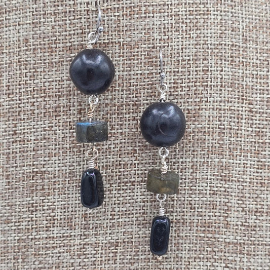 Smooth Lava and Matte Labradorite Wheels Earrings with Stainless Steel Ear Wires