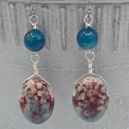 Speckled Ceramic Ovals & Blue Agate on Stainless Steel Ear Wires