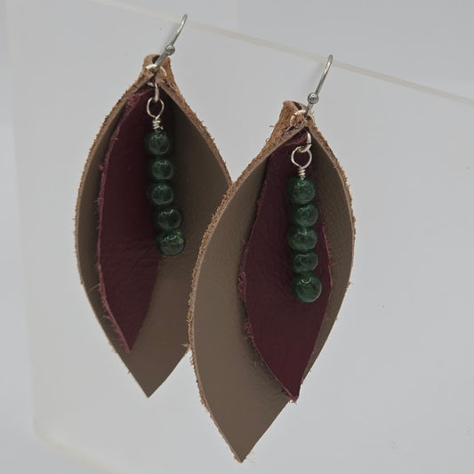 Taupe & Maroon Leaves With Green Aventurine Beads on Stainless Steel Ear Wires