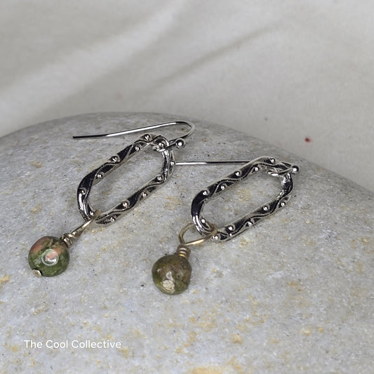 Unakite Drop Earrings with Embellished Silver Tone Ovals on Stainless Steel Ear Wires