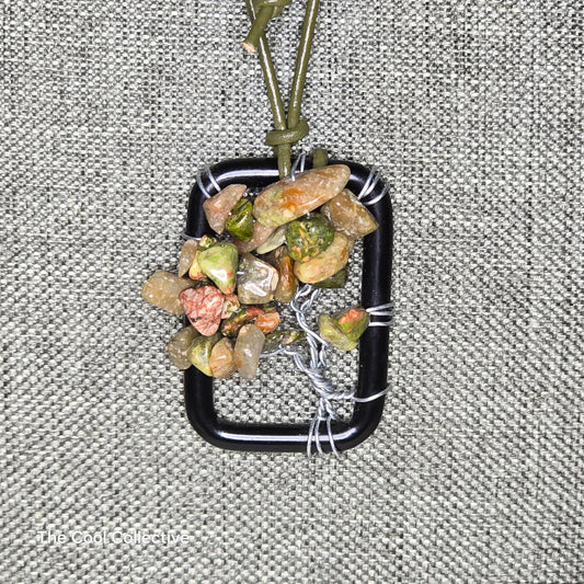 Unakite Tree of Life Pendant on Black Tone Frame on Olive Green Leather - Adjustable Style