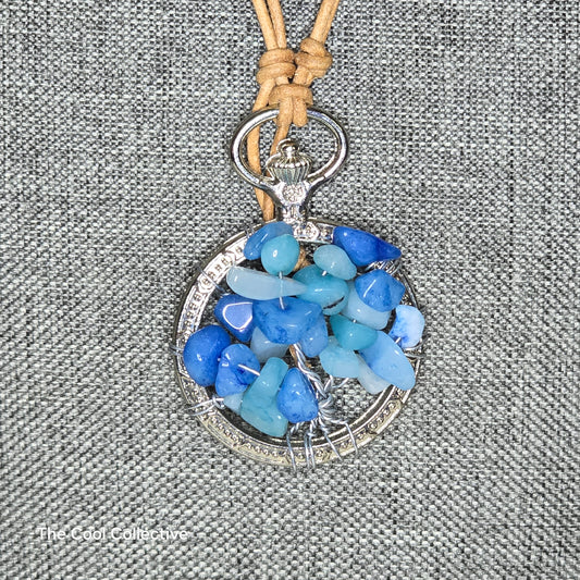 Tree of Life Pendant - Blue Quartz on Silver Frame on Natural Tan Leather - Adjustable Style