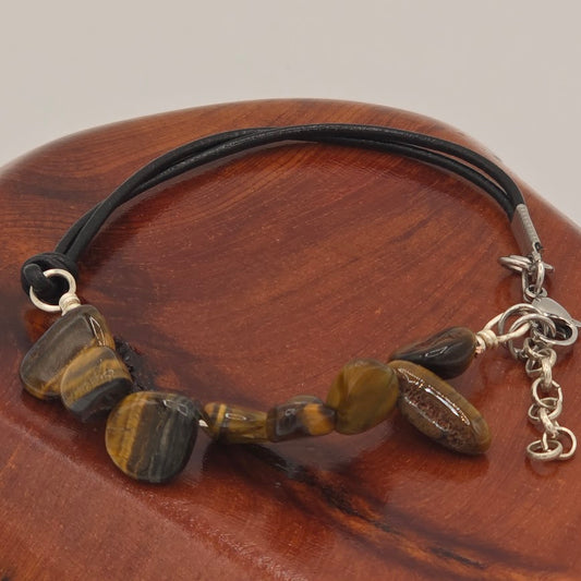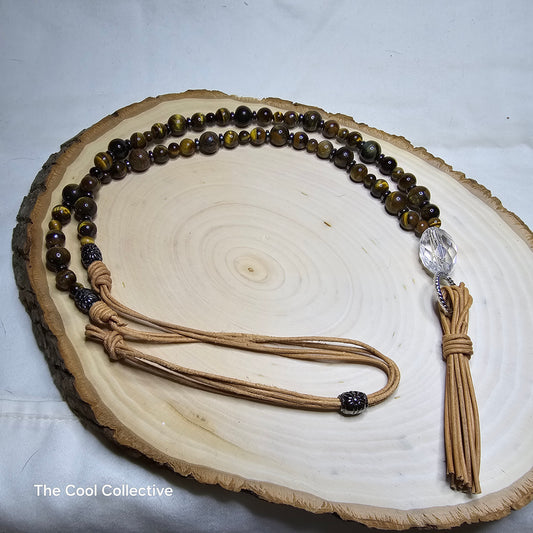 Tiger's Eye & Hematite Tassel Necklace on Natural Tan Leather, a Crystal Focal & Silver Tone Accents - Adjustable Style