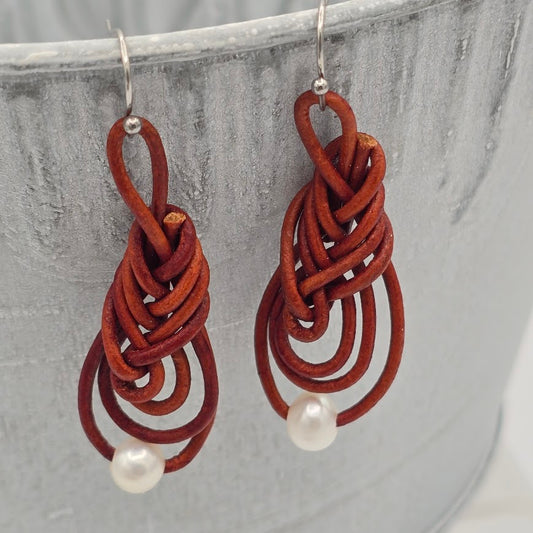 Turkish Red Leather Chinese Pipa Knot Earrings with Pearls and Stainless Steel Ear Wires