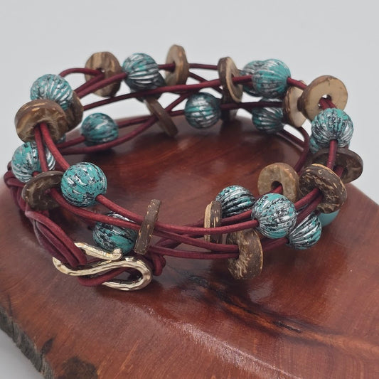 Turkish Red Leather Double Wrap Bracelet with Wood & Patina Beads