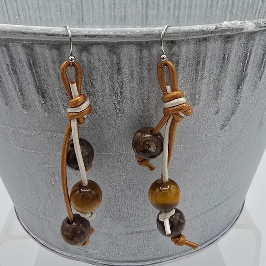 Two-Tone Leather Earrings with Boulder Opal and Tiger's Eye on Stainless Steel Ear Wires