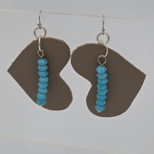 Taupe Leather Hearts With Turquoise Crystals on Stainless Steel Ear Wires