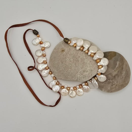 Champagne and White Paddle Pearls on Medium Brown Leather Necklace
