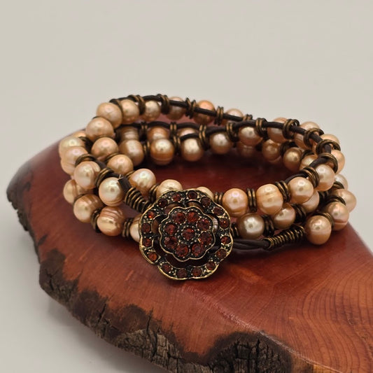 Champagne Pearls Triple Wrap Bracelet with Crystal Button, and Dark Brown Leather