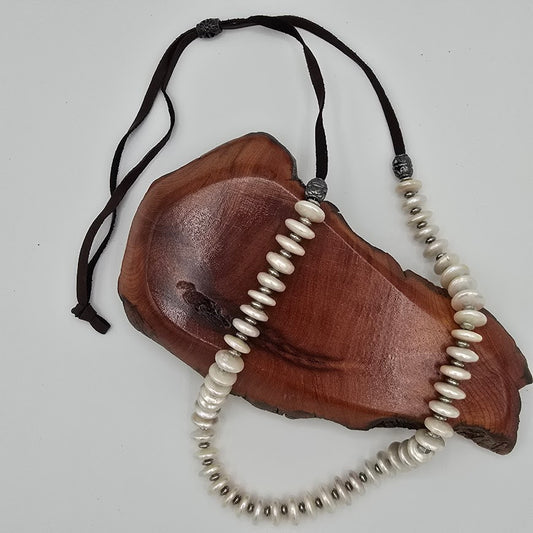Coin Pearls Necklace with Silver Tone Spacers on Brown Leather; Adjustable