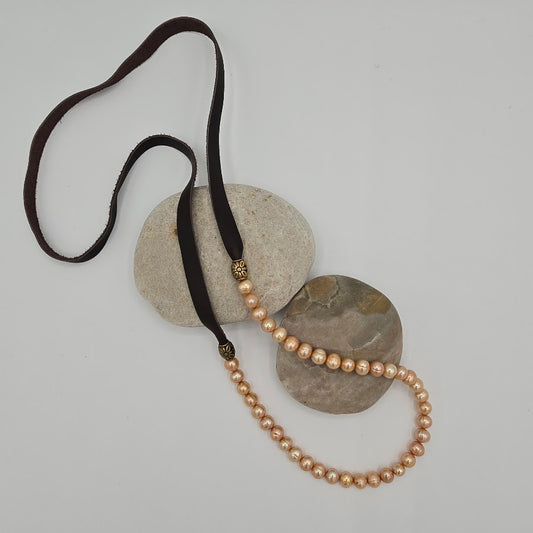 Champagne Pearls and Dark Brown Leather Necklace