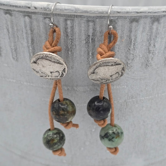 Buffalo Nickel Button Earrings on Natural Tan Leather with Sim. African Turquoise on Stainless Steel Ear Wires