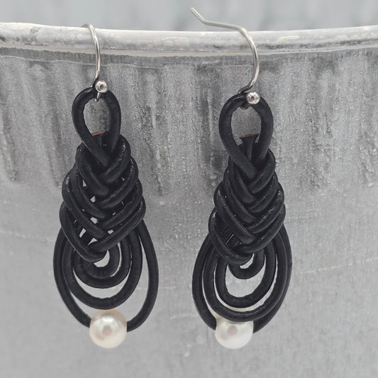 Chinese Pipa Knot, Black Leather, Pearls, Stainless Steel Ear Wires