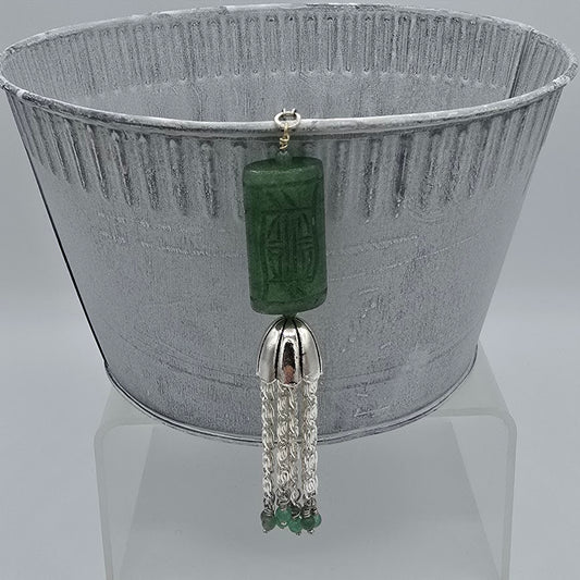 Carved Green Aventurine Focals, Beads & Tassel on Silver Tone Chain and Natural Tan Leather
