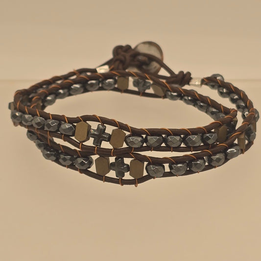 Brown Leather Double Wrap Bracelet With Hematite Beads - Celtic Crosses and Gold Tone Hematite