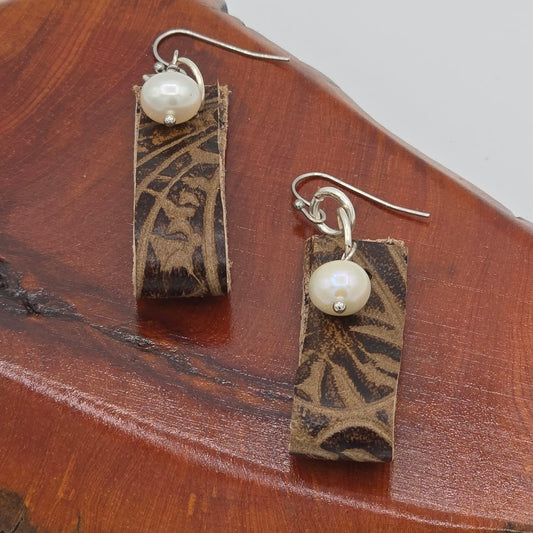 Brown Gator-Print Leather and One Pearl on Stainless Steel Ear Wires