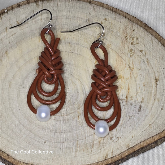 Chinese Pipa Knot, Medium Brown Leather, Pearls, Stainless Steel Ear Wires