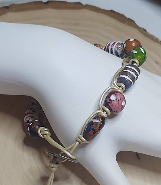 Colorful Clay Beads on Pearl White Leather