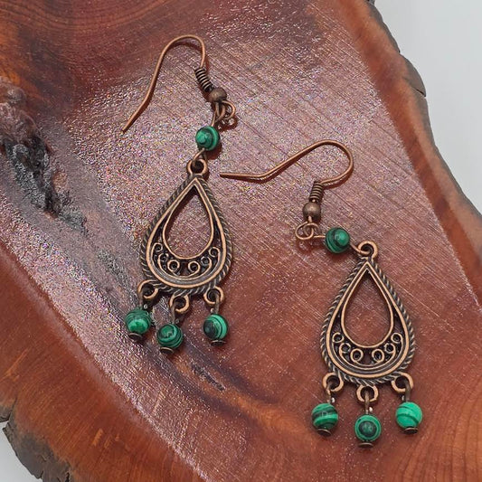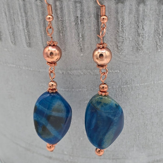 Long Blue Banded Agate Earrings With Copper Accents and Ear Wires