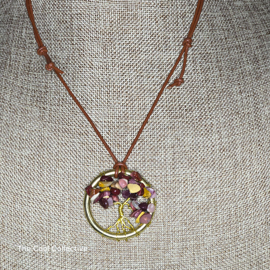 Mookaite Tree of Life Pendant on Gold Tone Frame on Saddle Brown Leather - Adjustable Style