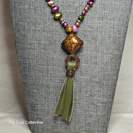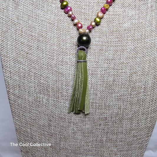 Multicolor Freshwater Pearls on Olive Green Deer Tan & Tassel With Silver Tone Accents