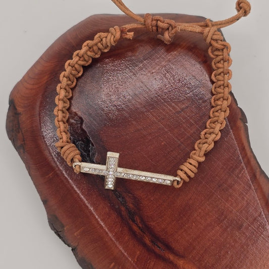 Macrame Crystal Cross on Natural Tan Leather Bracelet