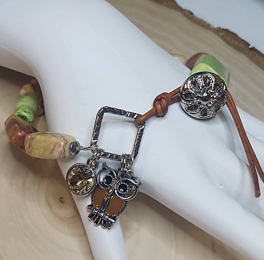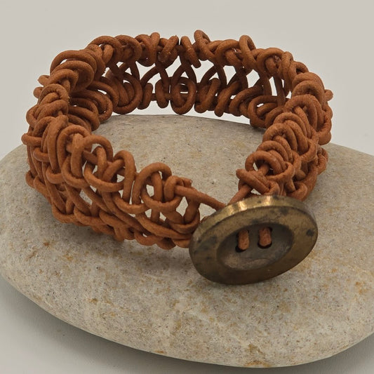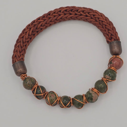 Medium Brown Leather Viking Knit With Unakite and Copper Bangle Bracelet
