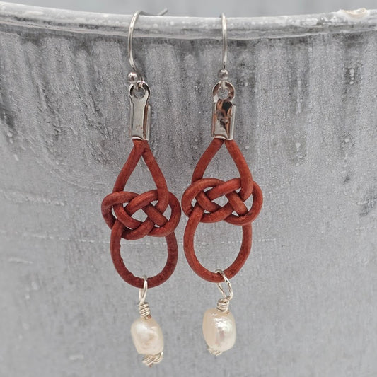 Natural Red Leather Celtic Knot with Pearls and Stainless Steel Ear Wires