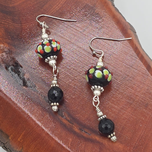 Multi-Color Lampwork & Faceted Onyx Earrings on Stainless Steel Ear Wires