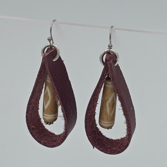 Maroon Leather Loops With Carved Bone Dangle on Stainless Steel Ear Wires