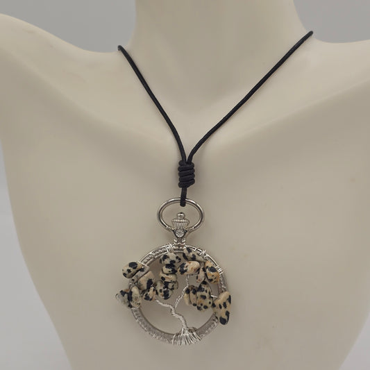 Dalmatian Jasper Tree of Life Pendant on Silver Tone Frame & Adjustable Black Leather