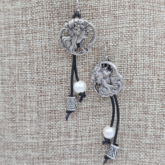 Goddess Button Earrings on Leather with Freshwater Pearls and Silver Tone Beads on Stainless Steel Ear Wires
