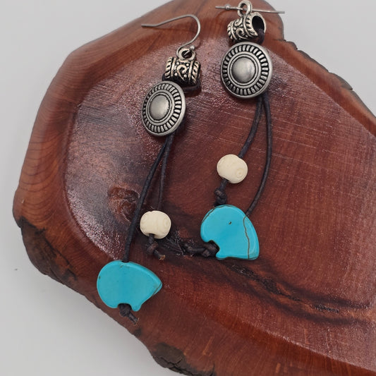 Zuni Bear Earrings with Silver Tone Button, Leather, Magnesite and Howlite