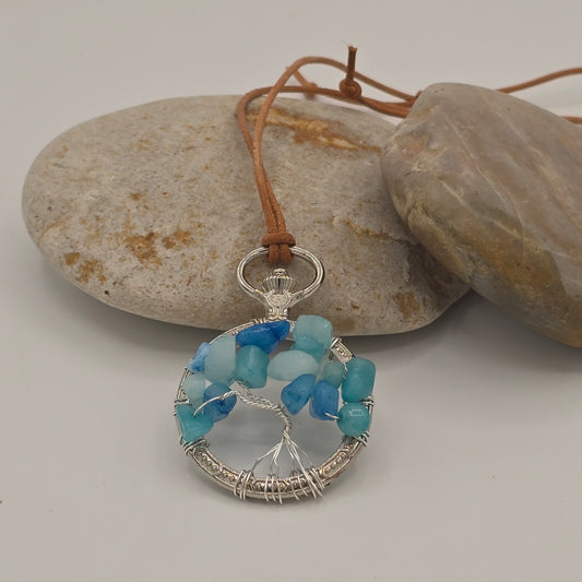 Blue Quartzite Tree of Life Pendant on Adjustable Natural Tan Leather