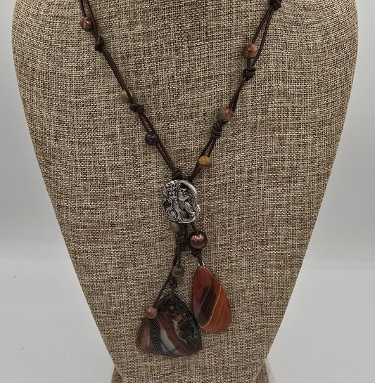 Dual Focal Stones of Banded Agate, Leather & Jasper Adjustable Length Necklace