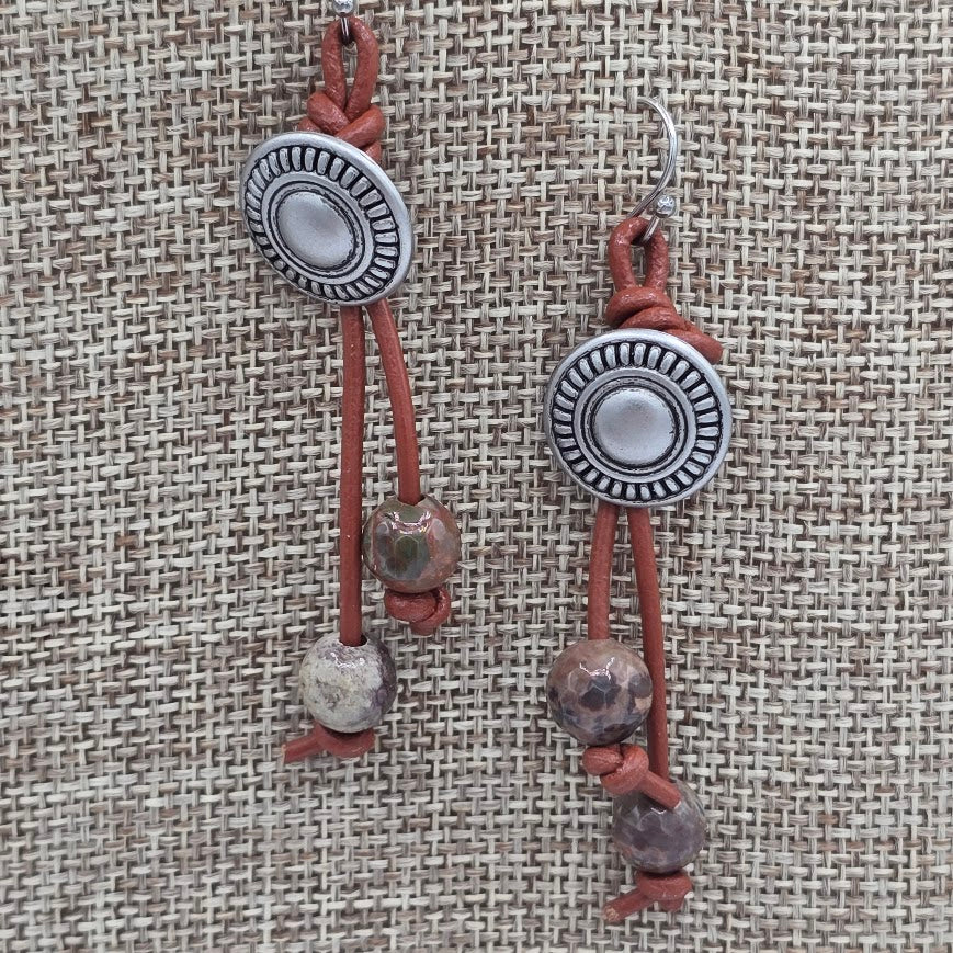 Pewter Tone Buttons on Saddle Brown Leather with Boulder Opal on Stainless Steel Ear Wires